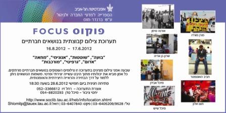 פוקוס - תערוכת צילום קבוצתית בנושאים חברתיים: הפתיחה: 28.6.2012 בשעה: 18:30 בספרייה למדעי החברה אוניברסיטת ת"א. שבעה אמני צילום מציגים בתערוכה זו צילומים העוסקים בנושאים חברתיים מרתקים. כל אמן מביא את יכולותיו מתוך היבט עשייה יצירתי ופרטי. משמות הנושאים ניתן ללמוד על דרך הבחירה והראייה היצירתית והאומנותית.